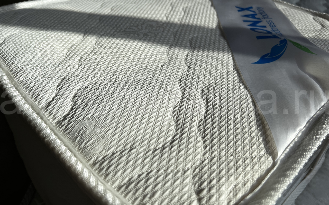 Верхнее покрытие матраса хлопковый жаккард - высокопрочная натуральная ткань, состоящая из хлопчатобумажного волокна с особым способом переплетения волокон. Хлопковый жаккард может быть двойным (дублированным) или недублированным. Как правило, дублированный жаккард используют в качестве верхнего покрытия для матрасов, чехлов и наматрасников. Особенность материала заключается в том, что рисунок, получаемый в результате переплетения нитей волокна, одинаковый с лицевой и изнаночной стороны. Самой важной характеристикой ткани является его экологичность и износостойкость.